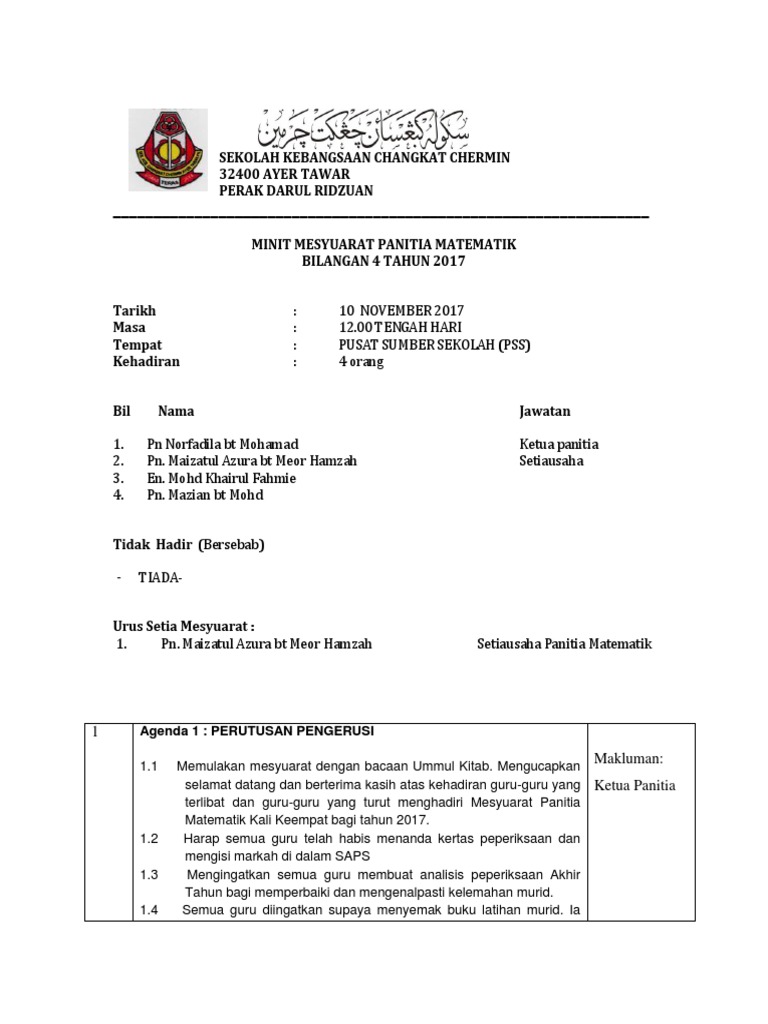 Minit Mesyuarat Panitia Matematik - 23 januari 2011 hari :. Contoh minit mesyuarat persatuan ibu bapa dan guru. Mesyuarat telah dipengerusikan oleh ketua panitia matematik dan matematik tambahan. Text of minit mesyuarat panitia matematik. Minit mesyuarat panitia pendidikan seni visual kali pertama 2015. Sesuatu minit mesyuarat perlulah mengandungi tajuk iaitu nama mesyuarat berkenaan ,bilangan mesyuarat yang biasanya di tulis diatas sekali,tarikh mesyuarat iaitu bila berikut merupakan koleksi minit mesyuarat panitia matematik bagi kali yang pertama, kedua, ketiga dan keempat.