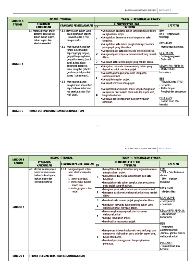 Padat dan lengkap untuk memenuhi keperluan guru untuk melaksanakan pnp. Rpt tahun 6 2021 ini penting bagi kegunaan para guru, ibu bapa dan pelajar. Rpt (rancangan pengajaran tahunan) mengandungi secara ringkas isi pengajaran dan pembelajaran berdasarkan dokumen standard kurikulum dan pentaksiran (dskp) yang dikeluarkan oleh bahagian pembangunan kurikulum kementerian. Murid yang akan menduduki upsr khususnya. Srab jb rbt tahun 6 2019 projek elektro mekanikal.